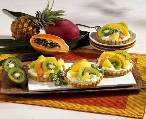 Bake in the preheated oven (electric cooker: 200 °C/ convection oven: 175 °C/ gas: level 3) for approx. 20 minutes. Remove from the ramekins and let cool down. In the meantime, peel and halve the papaya and remove the seeds from the fruit with a spoon. Cut the papaya crosswise into slices. Peel the mango and cut the flesh from the stone into slices. Drain pineapple and cut into pieces. Peel kiwis and cut into slices. Blanch briefly in hot water. Drain. Mix cream cheese, yoghurt and 2 tablespoons of sugar and spread evenly on the tartlets. Cover the tartlets with fruit.