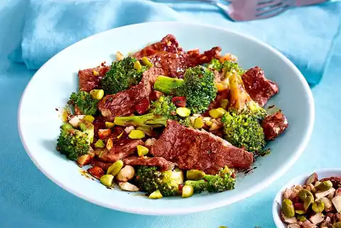 Fry the meat in hot oil for 2-3 minutes. Season with salt and pepper and remove. Broccoli, onions, ginger, nuts, each 1⁄4 TL cumin and coriander in hot frying fat for 2-3 minutes. Add soy sauce, 4 tablespoons of water and meat and season to taste.