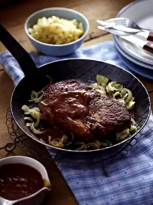 Sauté the rest of the onions in the frying fat. Dust with flour. Dissolve frying fat with 200 ml water. Stir in barbecue sauce, bring to the boil and simmer for about 5 minutes. Season to taste with whiskey, salt and pepper. Arrange everything.