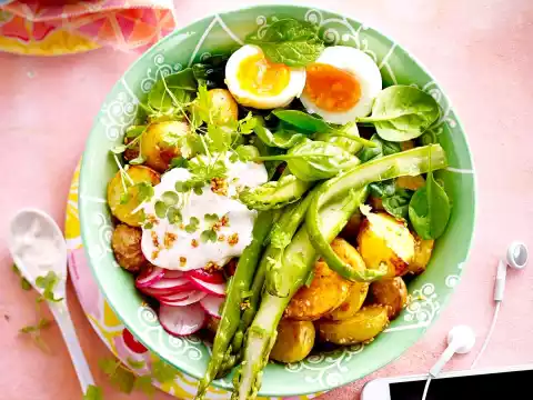 Rinse the eggs cold, peel and halve them. Arrange potatoes, radishes, spinach, asparagus and eggs. Add sauce. Sprinkle with chervil leaves and cress.