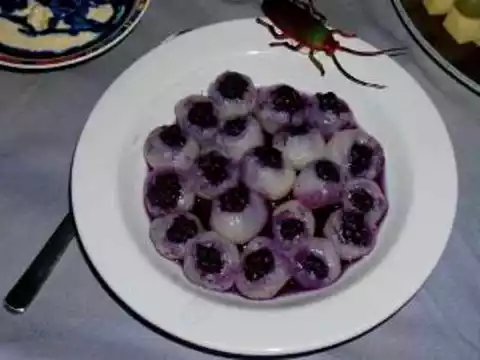 Then fill the hole with cranberries and pour the juice from the glass over the individual ''eyes''.