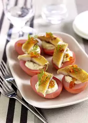 4 Drain the (now pink) egg yolks and fill them with yolk preparation. Cut the herring fillet into 8 strips, place one on each half egg. Divide the salmon eggs and serve.