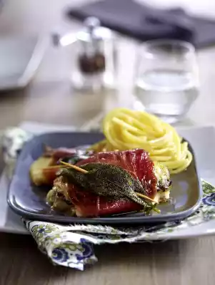 2 Place a slice of mozzarella cheese on a piece of ham. Place a sardine on top and roll it up. Then wrap a sage leaf around it and hold it in place with a wooden pick.