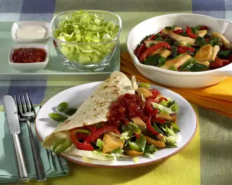 Add the tomatoes. Season with salt and pepper and keep warm. fry tortillas in a dry pan on both sides for about 2 minutes. Serve tortillas with vegetables, iceberg lettuce and sauces together.