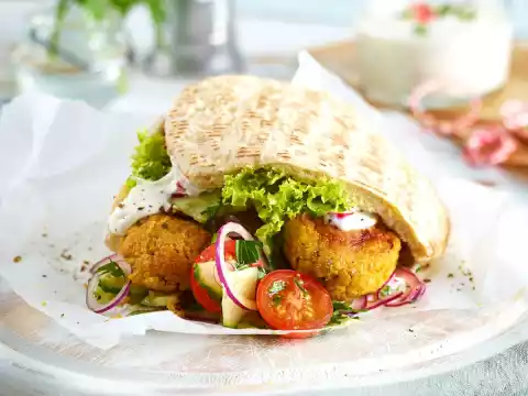 Mix with egg yolk, breadcrumbs and flour, season with 1 teaspoon salt and 1 pinch of cumin and chill for about 30 minutes. Form approx. 20 small balls from the falafel mixture and bake in a preheated oven (electric cooker: 175 °C/ convection oven: 150 °C) for approx. 12 minutes.