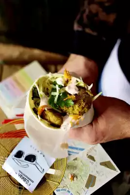 Put some coleslaw, parsley leaves and falafel in the middle. Wrap one side, roll the flat cakes into a bag with the paper. Sprinkle with some yoghurt sauce and garnish with carrot.