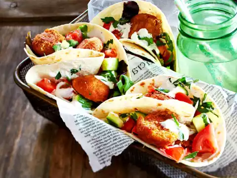 Heat frying oil in a high pot to approx. 180 °C (measure with a roast thermometer or hold a wooden stick inside; if bubbles rise at the stick, the correct temperature has been reached). Form approx. 24 small balls from the falafel mixture, press them slightly flat. Bake in hot frying oil in portions for 4-5 minutes until golden brown. Drain on kitchen paper. Heat the wraps or tortillas according to the instructions on the packet and spread with the sesame sauce. Spread the salad filling and falafel on top. Fold the wraps carefully.