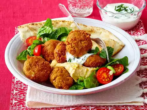 Bake in hot frying fat in portions for 4-5 minutes until golden brown. Drain on kitchen paper. Cut flat breads in half. Arrange falafel on 1/2 flatbread with salad, hummus and yoghurt sauce.