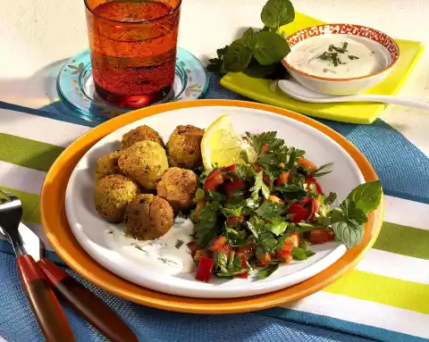Bake in hot frying fat in portions for 4-5 minutes until golden brown. Drain on kitchen paper. Serve the falafel with the salad and yoghurt mint dip. Serve garnished with mint and lemon.