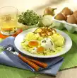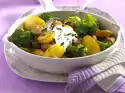 Set aside. Wash the mint, dab dry and cut into fine strips. Mix yoghurt, mint and 1 pinch each of salt and sugar. Drain chick peas, rinse briefly and drain. Peel onion and garlic and chop finely.