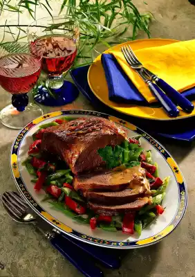Turn the roast from time to time and add the remaining stock little by little. Clean and wash the beans and peppers. Cut beans diagonally into pieces and peppers into strips. Steam the beans in little boiling salted water covered for about 15 minutes.