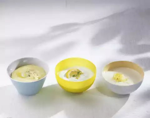 Boil the eggs hard for about 8 minutes. Then rinse cold and peel. Remove the egg yolk and pass through a sieve. Finely chop the egg white. Peel and finely dice the shallots. Mix prepared ingredients and sour cream.