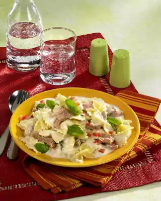 Deglaze with stock and cream while stirring. Season to taste with lemon juice, salt and pepper. Drain tuna, pluck into pieces and warm up in the sauce. Drain the pasta and let it drain. Mix the pasta carefully with the sauce. Garnish with diced tomatoes and basil