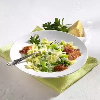 Let simmer for about 8 minutes. Add the peas after about 5 minutes. Wash parsley, dab dry, put something aside for garnishing, chop the rest finely. Drain the pasta and let it drain. Add bacon and parsley to the sauce and season with salt and pepper.