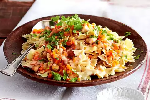 Wash the chervil, shake dry and chop coarsely. Season sauce with salt and pepper. Drain the noodles. Mix with sauce and chervil.