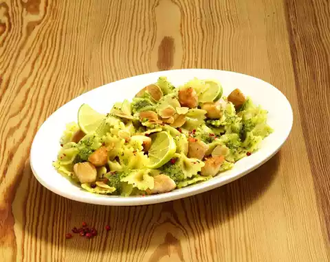 Wash chicken fillet, dab dry and cut into cubes. Heat 1 teaspoon of oil in a frying pan. Fry chicken cubes for about 5 minutes while turning and season with salt and pepper. Season pesto with salt, pepper and 1 pinch of sugar. Drain the pasta, mix with half of the pesto and arrange on 2 plates. Sprinkle chicken cubes on top and garnish with the lime wedges and pink berries. Put the rest of the pesto in a glass, close it tightly and use it for the next 2 weeks