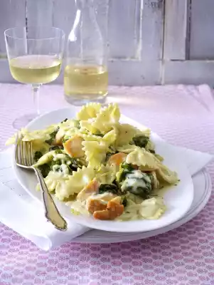 Heat 2 tablespoons of oil in a large frying pan, fry the fish cubes for about 3 minutes, season with salt and pepper and remove. Mix the noodles and fish with the spinach, heat up and season again with salt and pepper.