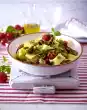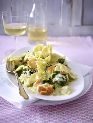 Drain the pasta, except for about 100 ml of pasta water, and add the spinach cream and salmon. Mix everything. Season to taste with salt and pepper, arrange