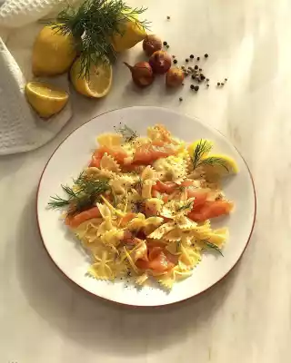Season to taste with salt and pepper. Cut salmon into strips. Wash the dill, dab dry, put something aside for garnishing and chop. Add salmon and dill to the sauce. Mix pasta and sauce and divide into four plates