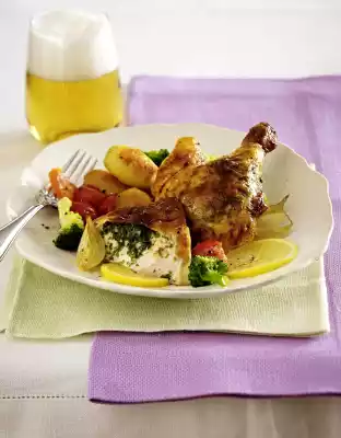 Remove the chicken from the fat pan and keep it warm. Pour broccoli into a sieve, drain a little and mix with the tomatoes and stock. Arrange chicken and vegetables on a plate, garnish with lemon slices if necessary. Add potatoes