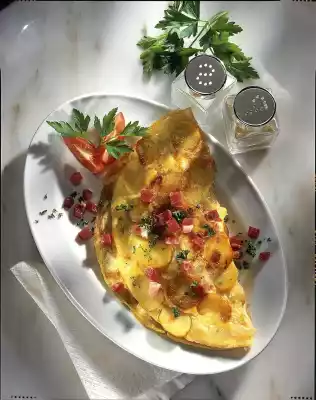 Sprinkle with diced ham and possibly chopped parsley. Serve with tomato wedges if desired.