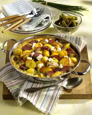 Pour egg milk over the potatoes and let it set for about 10 minutes at low heat. Cut the feta cheese into small cubes. Wash the chives and cut into fine rolls. Sprinkle cheese and chives over the farmer's breakfast.