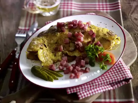 Spread diced ham on the omelettes. Garnish with tomato, parsley and cucumber.