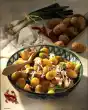 Wash the potatoes and cook in boiling water for 20-30 minutes, then drain and chill. In the meantime peel and dice the onion. Cut ham into cubes.