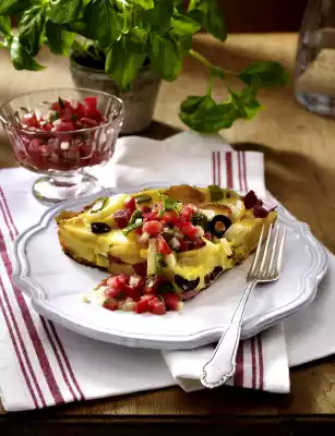 Heat the oil in a high coated pan (approx. 22 cm Ø) and fry the potatoes for approx. 12 minutes. Add salami, zucchini, onion and olives and fry again for about 5 minutes. Mix eggs and cream, season with salt and pepper and pour over the potatoes. Cover and leave to set for approx. 10 minutes over medium heat