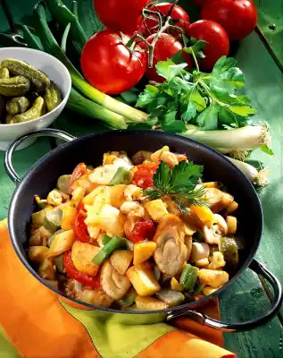 Fry the farmer's breakfast in a coated pan at high heat for about 5 minutes. In the meantime clean and wash the spring onions and cut them into large pieces. Wash, clean and quarter the tomatoes. Cut gherkins into slices, Schillerlockle diagonally into slices.