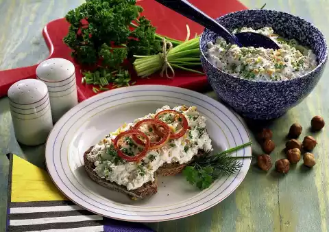 Stir in the chives, parsley and nuts, except for something to sprinkle. Peel onion, cut into rings and roll in paprika. Put curd on the bread and garnish with onion rings, nuts and herbs.