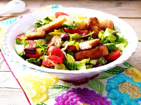 Heat 100 ml of oil in a frying pan and fry the cheese in it for about 5 minutes, turning. Marinate salad with lemon, 4 tbsp. oil, salt and pepper. Arrange cheese sticks and salad