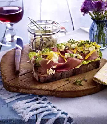 Coarsely grate the cheese. Wash the salad, dab dry and arrange on the slices of bread. Cover the breads with 3 slices of ham, place the egg yolks and cheese on the ham and sprinkle with garden cress.