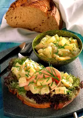 Drain the pineapple pieces. Cut the cheese into small pieces. Wash the chives and cut into small rolls except for a few tips for garnishing. Stir yoghurt, mayonnaise and mustard until smooth. Fold in pineapple and cheese pieces and half of the chive rolls. Season to taste with salt, pepper and Tabasco. Clean and wash the salad and pluck into bite-sized pieces. Lightly grease the slices of bread. Spread lettuce leaves on top. Add turkey breast cold cuts and pineapple salad. Sprinkle with remaining chives and garnish