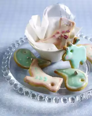 boots, deer and tears). Place on 2 baking trays lined with baking paper. Bake in the preheated oven (electric cooker: 175 °C/ convection oven: 150 °C/ gas: level 2) for 8-10 minutes. Remove the cookies and let them cool down on a cake rack. Mix 250 g icing sugar and egg white to a smooth glaze. If the icing is too firm, stir in some water. Cut the icing in thirds. Colour 1 part blue and 1 part pink. Pour the icing into three piping bags. Crumble the candied rose petals.
