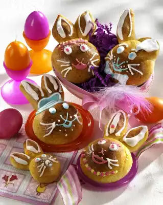 Line a baking tray with baking paper and place the heads on it. Separate the egg. Brush one corner of the ears with egg white and put 2 ears with the brushed corners under a rabbit head. Press on lightly. Bake in the preheated oven (electric cooker: 200 °C/ convection oven: 175 °C/ gas: level 3) for 20-25 minutes. Mix egg yolk and cream, brush the rabbits with it after about 15 minutes and bake them ready. Let the bunnies cool down on a cake rack. Mix the remaining egg whites and icing sugar. Put about 1/3 of the white icing in a piping bag. Divide the rest of the icing in thirds and colour pink, light blue and yellow.