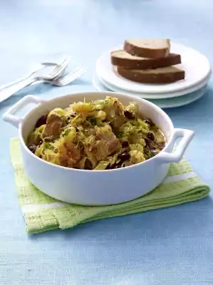 Fry the onion and leek briefly. Add the sauerkraut and sauté briefly. Deglaze with 1⁄2 l water. Stir in broth and Sambal Oelek, bring to the boil, cover and stew for about 10 minutes.