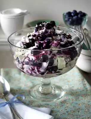 Rinse and sort blueberries and drain well. Mix with the jam. Finely chop the chocolate. Coarsely crumble the meringue shells.