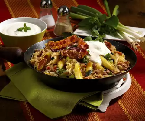 Add marjoram and fold in. Season the pasta pan with salt and pepper. Garnish with slices of bacon, remaining marjoram and a dash of sour cream. Add the rest of the sour cream.