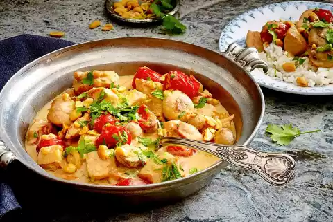 Season with salt and pepper, take out. Fry the mushrooms in frying fat, season. Stir in 150 ml water, cream and peanut cream, bring to the boil. Add meat and tomatoes, simmer for about 5 minutes.