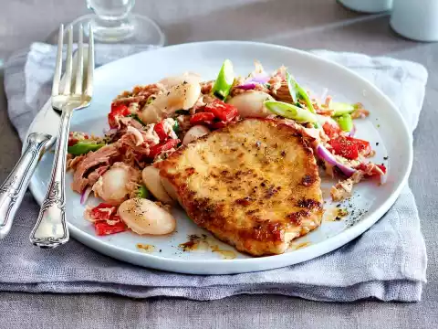 Wash the schnitzel and dab dry. Heat 2 tablespoons of oil in a large frying pan. Fry the cutlets in it on each side for about 3 minutes. Season with salt and pepper and serve with the bean salad.