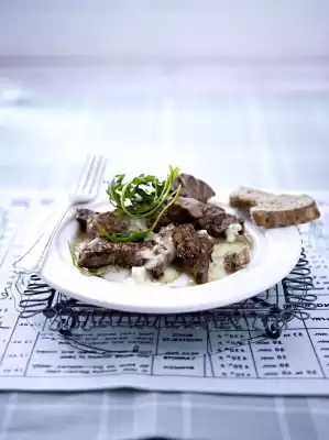 Clean, wash and drain the rocket. Dab meat dry and cut into strips. Heat 2 tablespoons of oil in portions in a coated frying pan. Fry the meat for 2-3 minutes, turning it over, in a bowl. Squeeze lemon. Add lemon juice and 2 tablespoons of oil to the meat, mix and season with salt, pepper and 1 pinch of sugar.