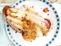 Divide into 4 smaller, ovenproof plates or in a casserole dish. Arrange the cheese in pieces on top. Bake under the preheated grill of the oven for 3-4 minutes. Take out plate or casserole dish, let cool down briefly, arrange rocket on top. Bread tastes good with it
