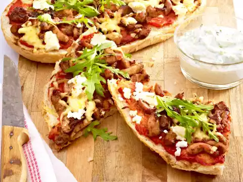 In the meantime, sort out the rocket, wash and drain. Take out the pizza. Put the salad on top. Add tzatziki.
