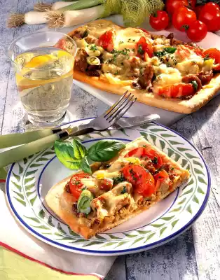 Mix the dough and roll out into a rectangle (30x25 cm) on a lightly floured work surface. Cut the dough sheet in half lengthwise and place them side by side on a baking tray lined with baking paper. Brush with mustard, spread gyros, spring onions and tomatoes on top and sprinkle with cheese. Bake in the preheated oven (electric cooker: 200 °C/ gas: level 3) for about 18 minutes. Wash the thyme, dab dry and pluck the leaves from the stalks. Take the pizza out of the oven, sprinkle with thyme and serve garnished with basil