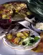 Peel and finely chop the garlic. Peel and finely chop the onion. Heat oil in a pan, add gyros, onion and garlic and fry for 5-6 minutes while turning. Season to taste with salt, pepper and paprika. Remove from the pan and let it cool down a little. Meanwhile clean, wash and cut spring onions into rings. Clean, wash and slice the tomatoes.
