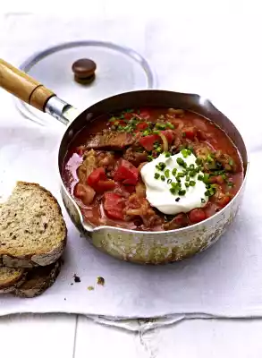 Add tomatoes and 400 ml water to the gyros, bring to the boil and simmer for 8-10 minutes. Wash chives, shake dry and cut into fine rolls. Arrange the gyros pot with a blob of shame and sprinkle with chives. Bread tastes good with it