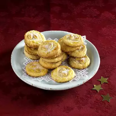 Finely grate the marzipan. Knead butter in flakes, icing sugar, flour and marzipan to a smooth dough. Form into a roll (approx. 4 cm Ø). Wrap in foil and chill for about 1 hour. Mix sugar and ground almonds. Whisk the egg yolk, brush the roll with it and turn it in the sugar mixture. Cut into approx. 5 mm thick slices.