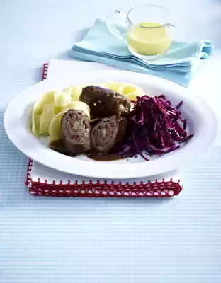 Drain the pasta. Arrange red cabbage salad, noodles and roulades on a plate