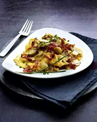 Briefly fry the onion, ham and mushrooms in hot butter. Pour eggs over it and let it simmer for about 2 minutes, stirring occasionally. Sprinkle with chives.